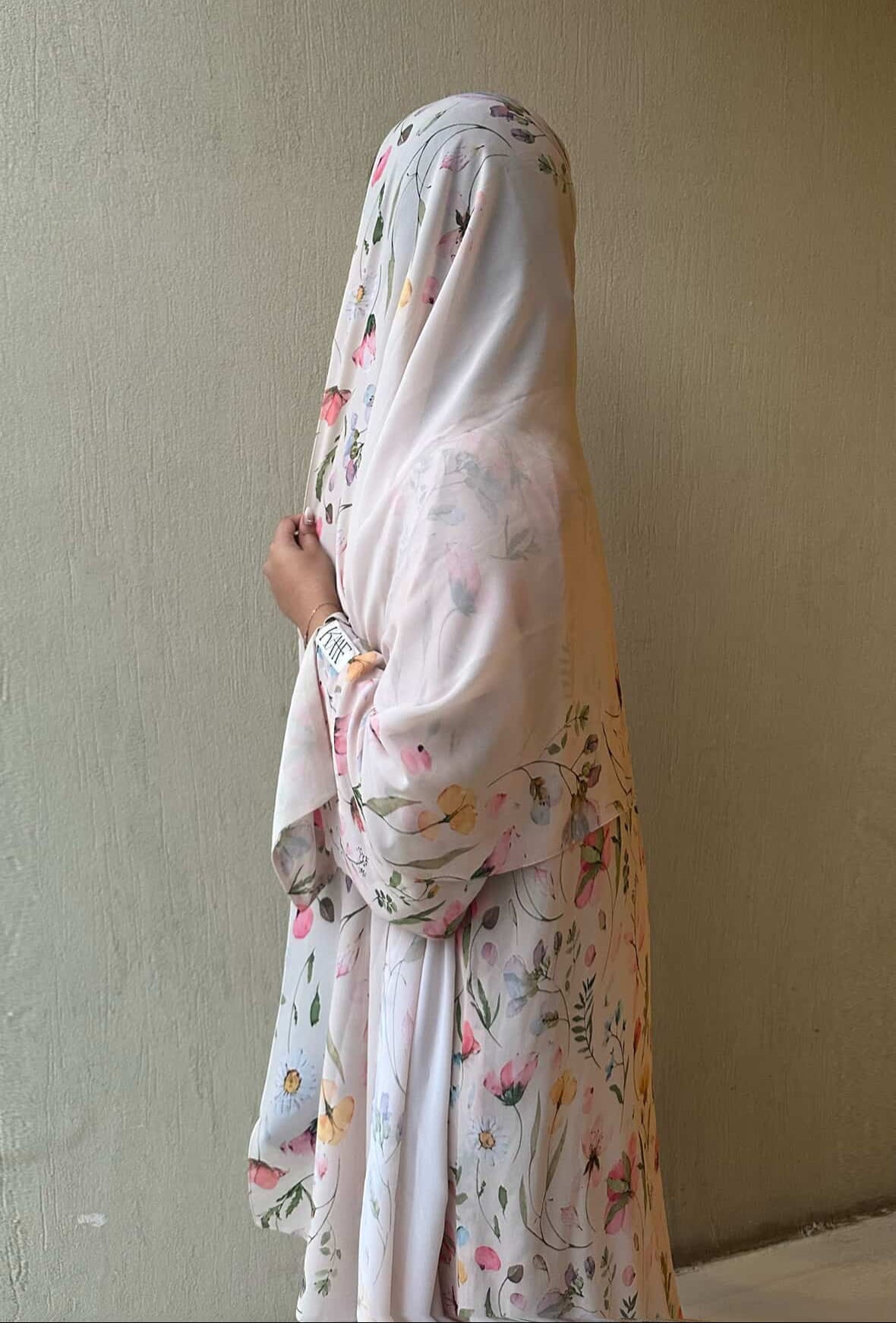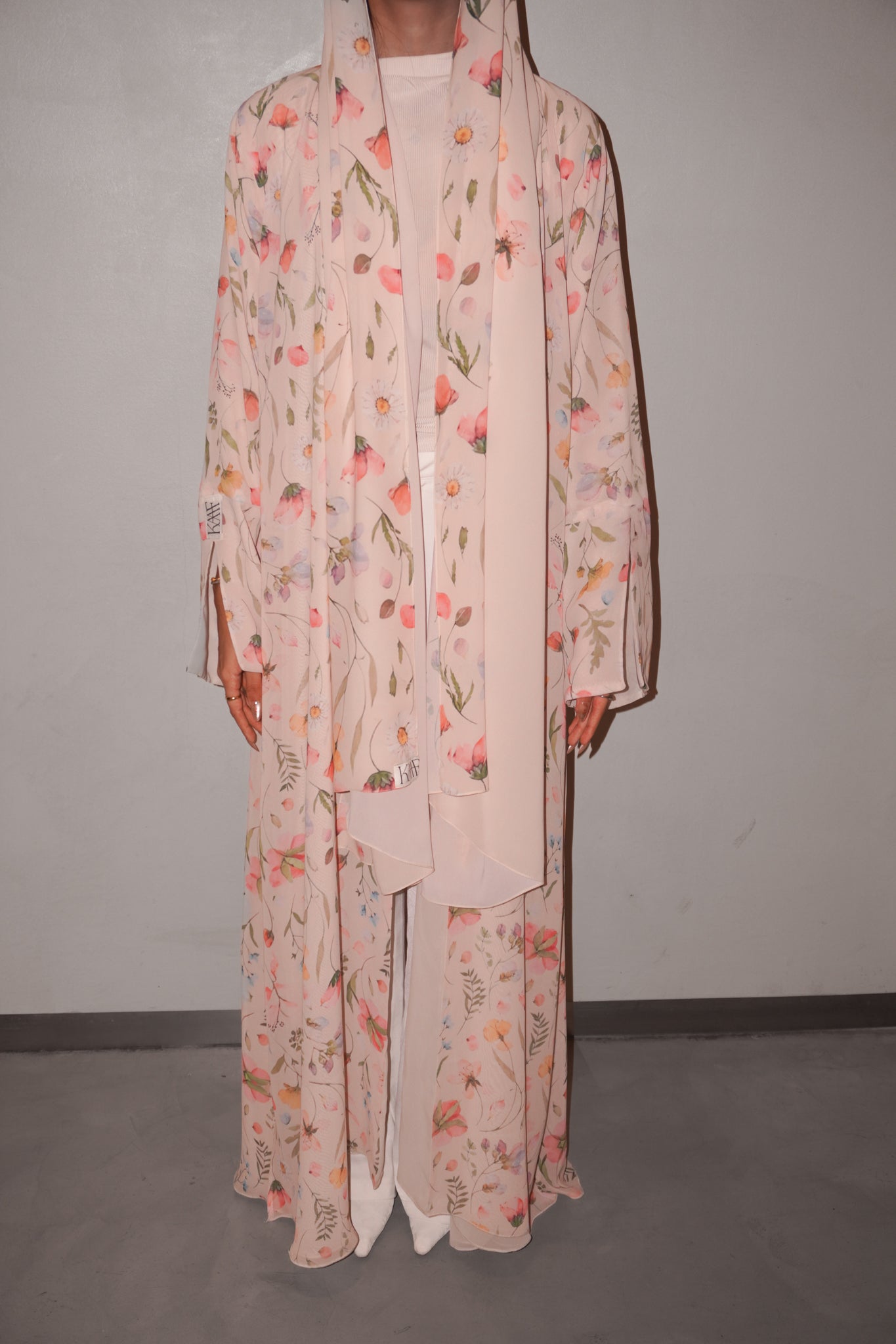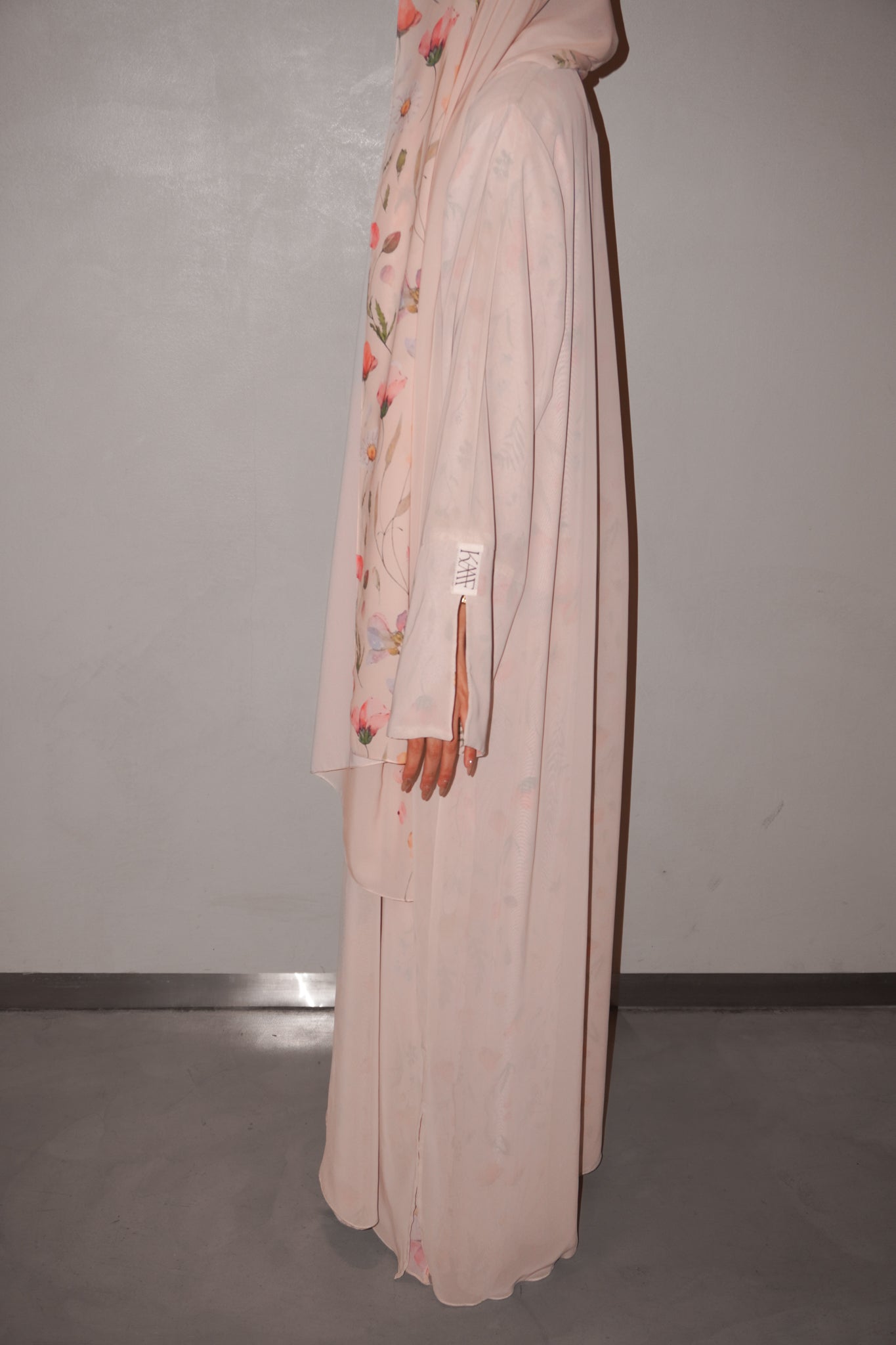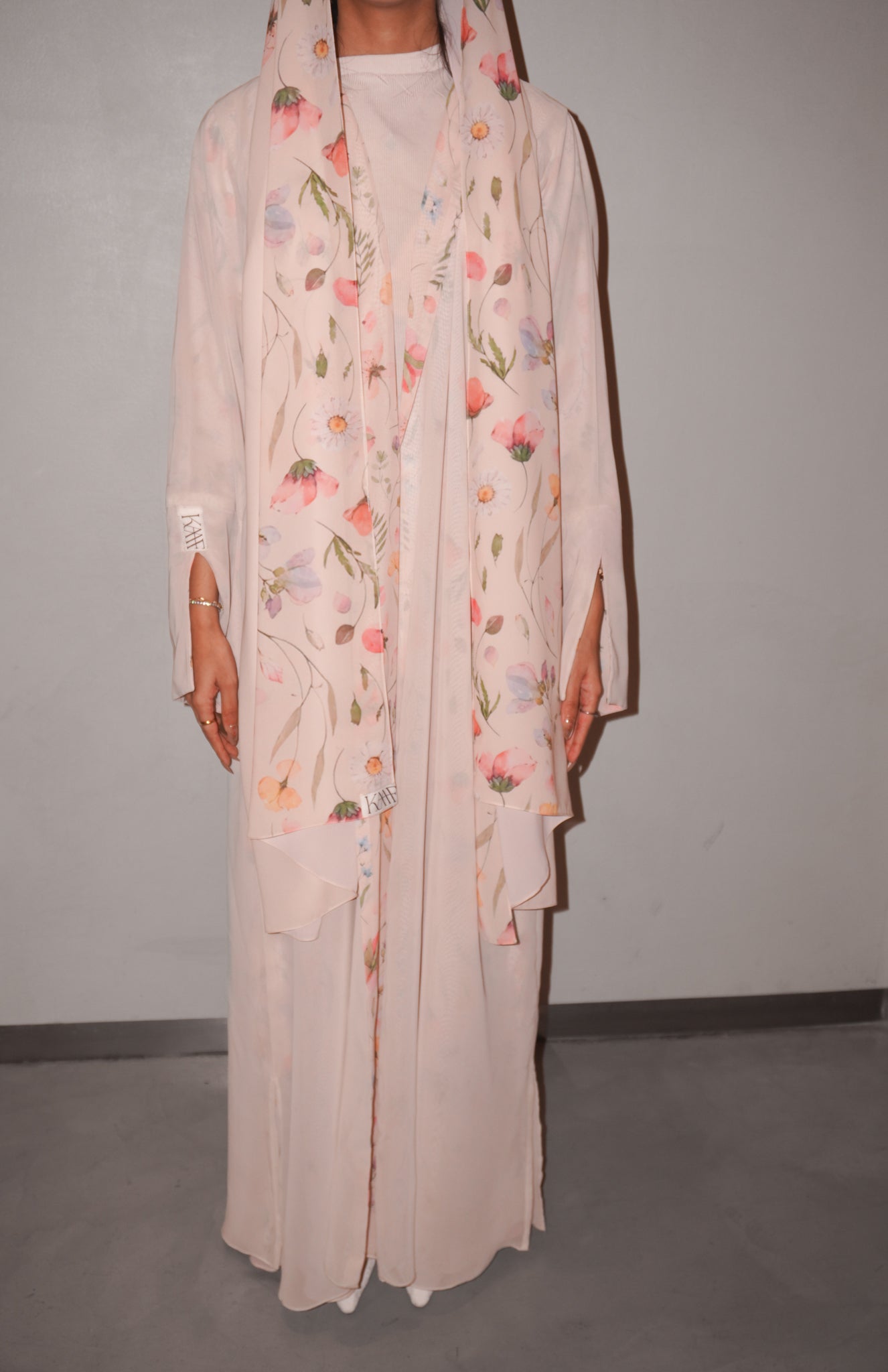 a blush-pink reversible floral chiffon abaya that flips into two looks. light as air, made for summer days, finished with a matching chiffon sheila.