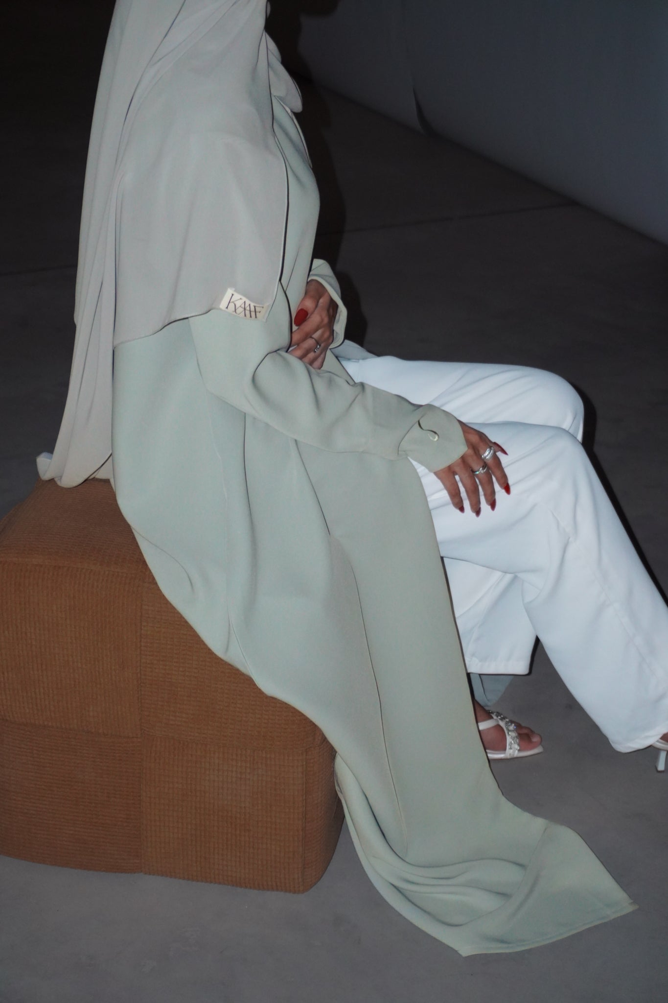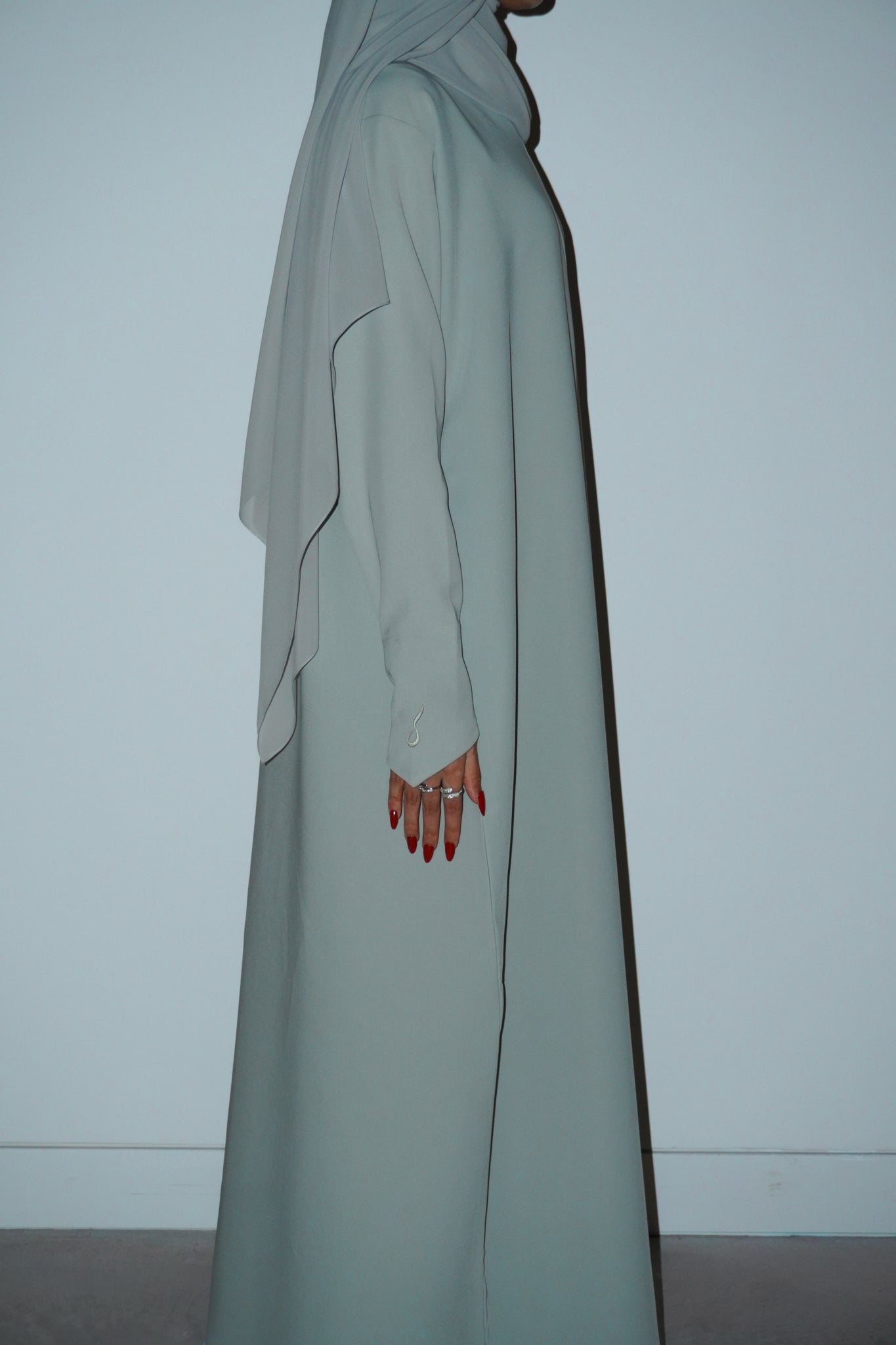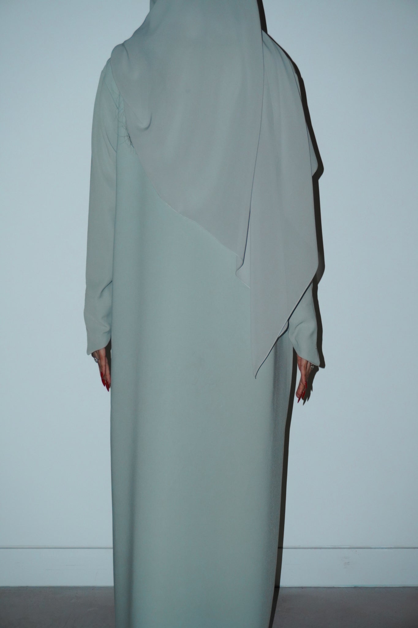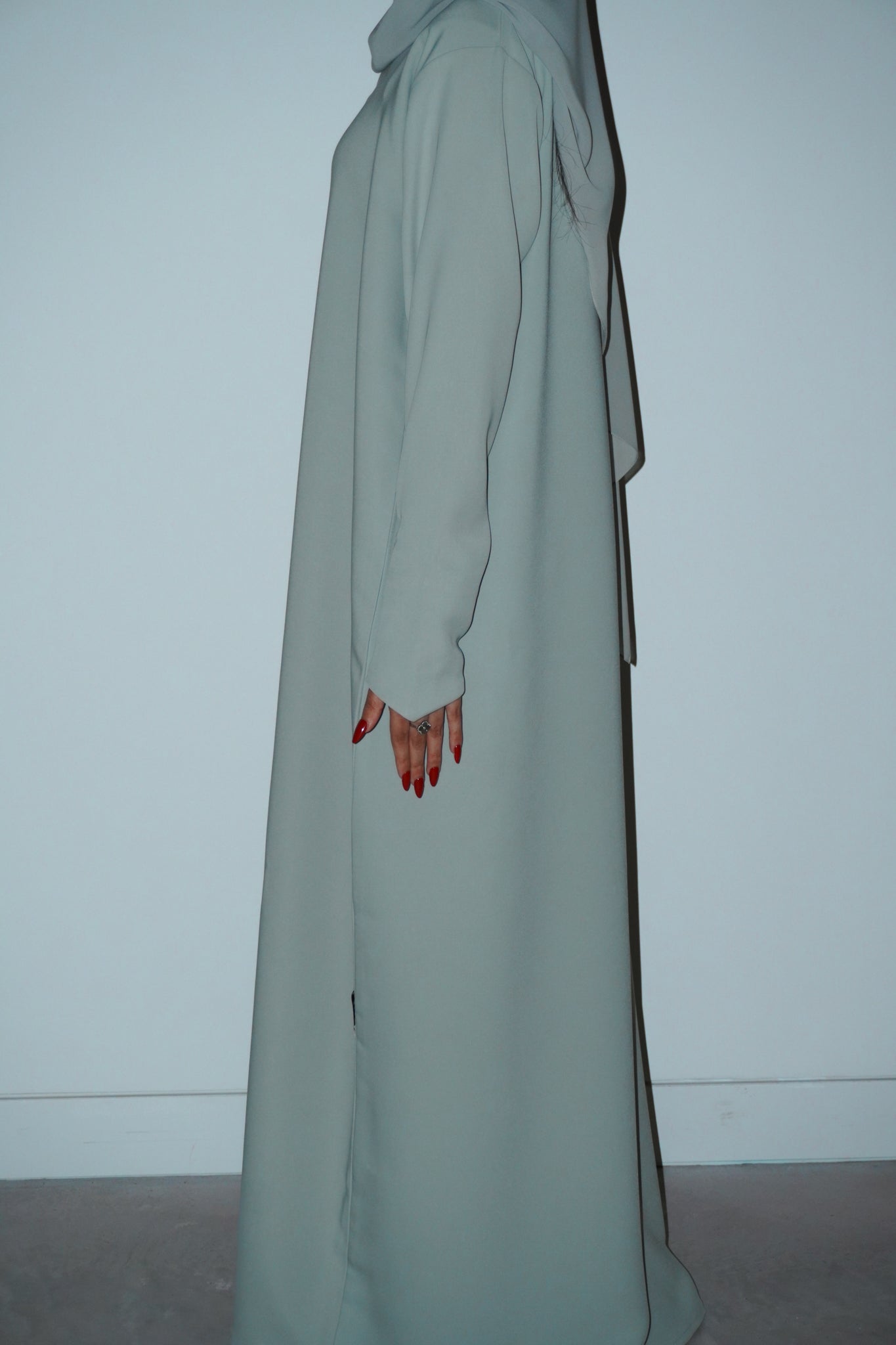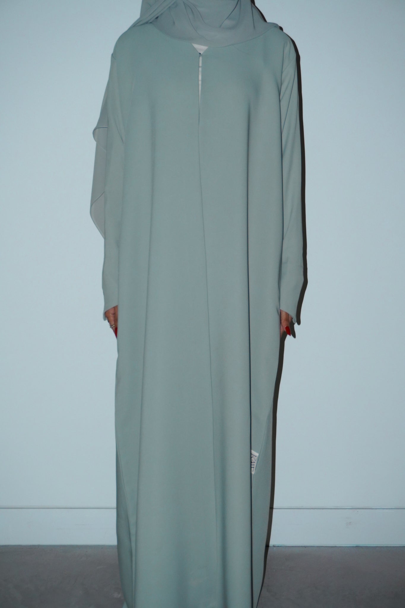 sage-green abaya crafted from barbie crepe, designed for effortless wear and comfort. comes with a matching chiffon sheila.